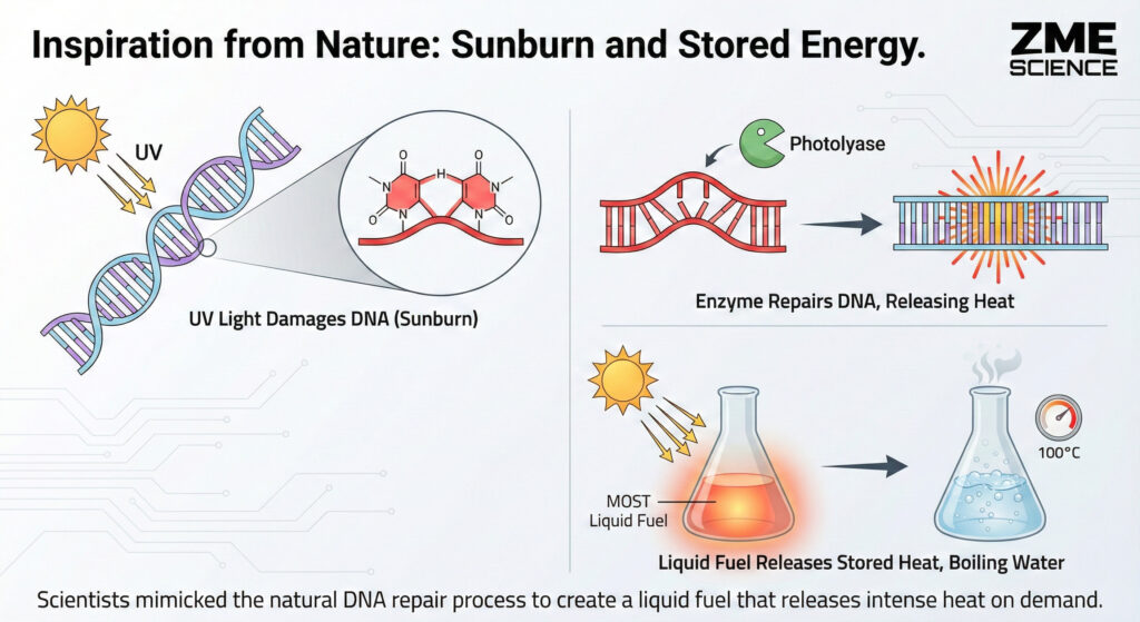 By mimicking the genetic damage caused by sunburn, they created a liquid that acts like a rechargeable thermal battery. It swallows sunlight, locks the energy in chemical bonds, and releases it as intense heat months later on demand.