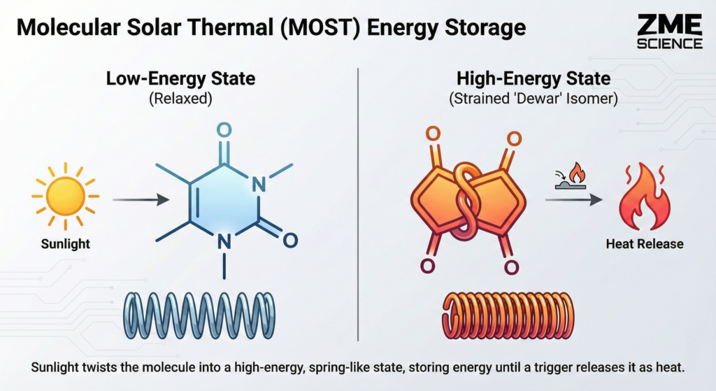 The concept is known as molecular solar thermal (MOST) energy storage. Scientists have experimented with this technology for quite some time. The idea is simple: find a molecule that absorbs light and twists into a strained, high-energy shape.