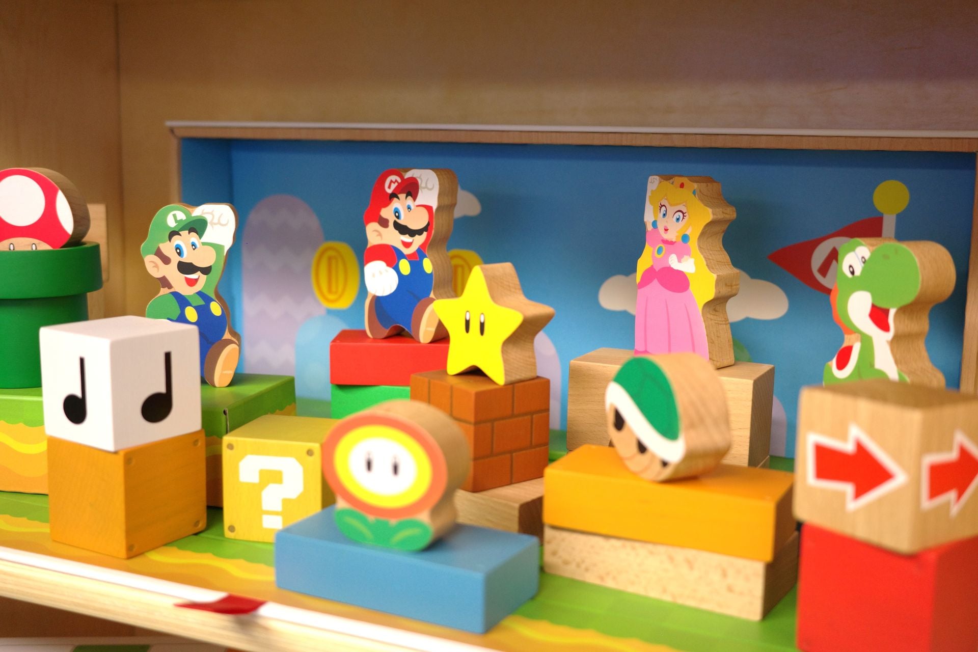 After launching a slew of kids-centric toys and apps in Japan last year, Nintendo is bringing its My Mario lineup to the U.S. and Europe starting Thursday, Feb. 19. Just like its recent Alarmo alarm clock and talking Wonder Flower, the entire suite is a strange mix of tech and non-tech. And still, I immediately gravitated to the wood block set. These come in either 30-piece or 3-piece sets, though spending more will grant you four wooden figurines of Mario, Princess Peach, Yoshi, and Luigi, plus a backdrop reminiscent of the green field and blue sky of the first Super Mario Bros. game.