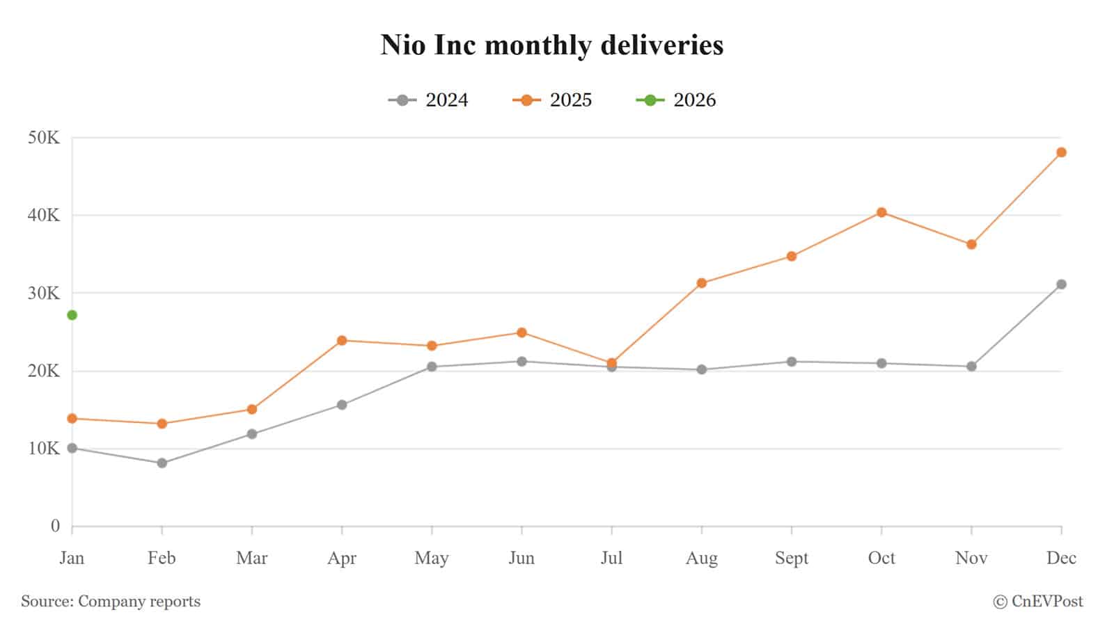 - Nio delivered 27,182 vehicles in January, marking a 96.08% year-on-year increase, though down 43.53% from December.
