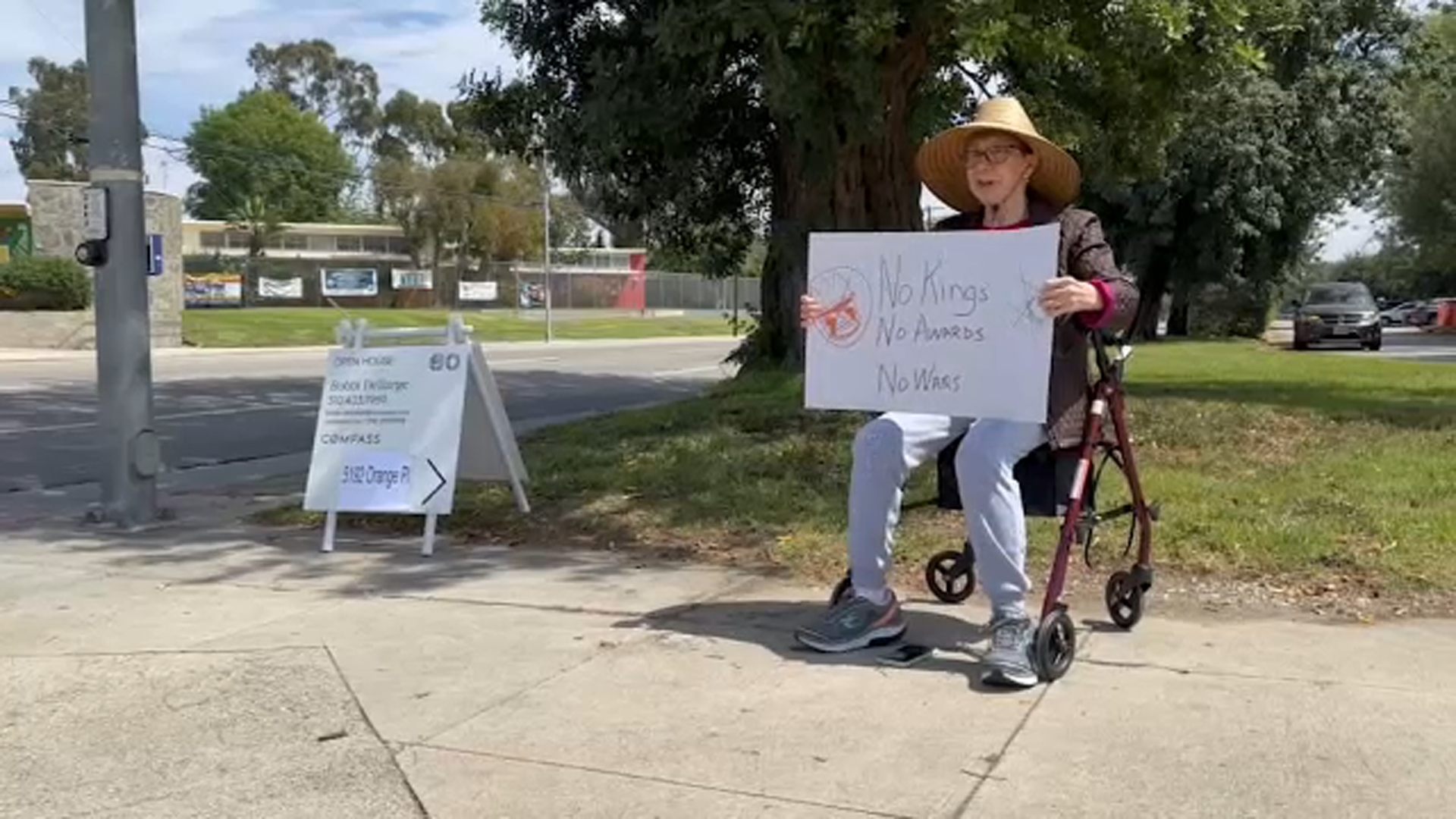 Judy Bershak, 79, is battling cancer and has limited mobility, but said she feels strongly about the message behind the “No Kings” protests. So, she set up shop outside her apartment complex at the corner of Obama and Hauser with a handmade sign.