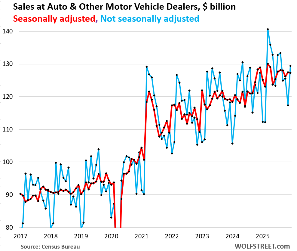 Not seasonally adjusted, sales jumped by 10.3% from November to $127 billion. But November and October had been weak as EV sales plunged when the federal incentives expired at the end of September, dragging down overall vehicle sales.