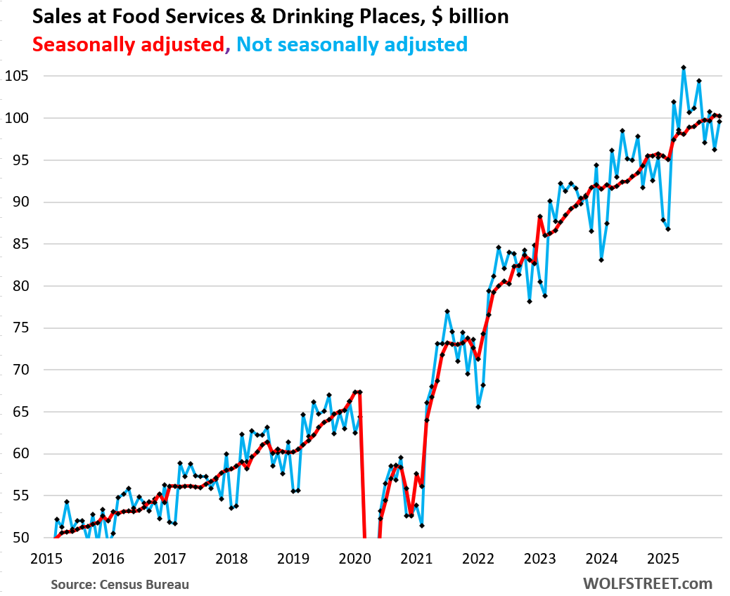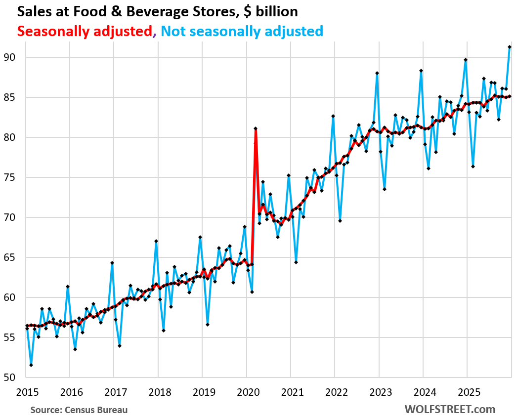 The seasonal adjustment factor whacked $35.7 billion off actual sales in December, the most ever. That was 12.6% more than in December 2024, when it had whacked off $31.7 billion. Clearly, something went awry in that seasonal adjustment factor.