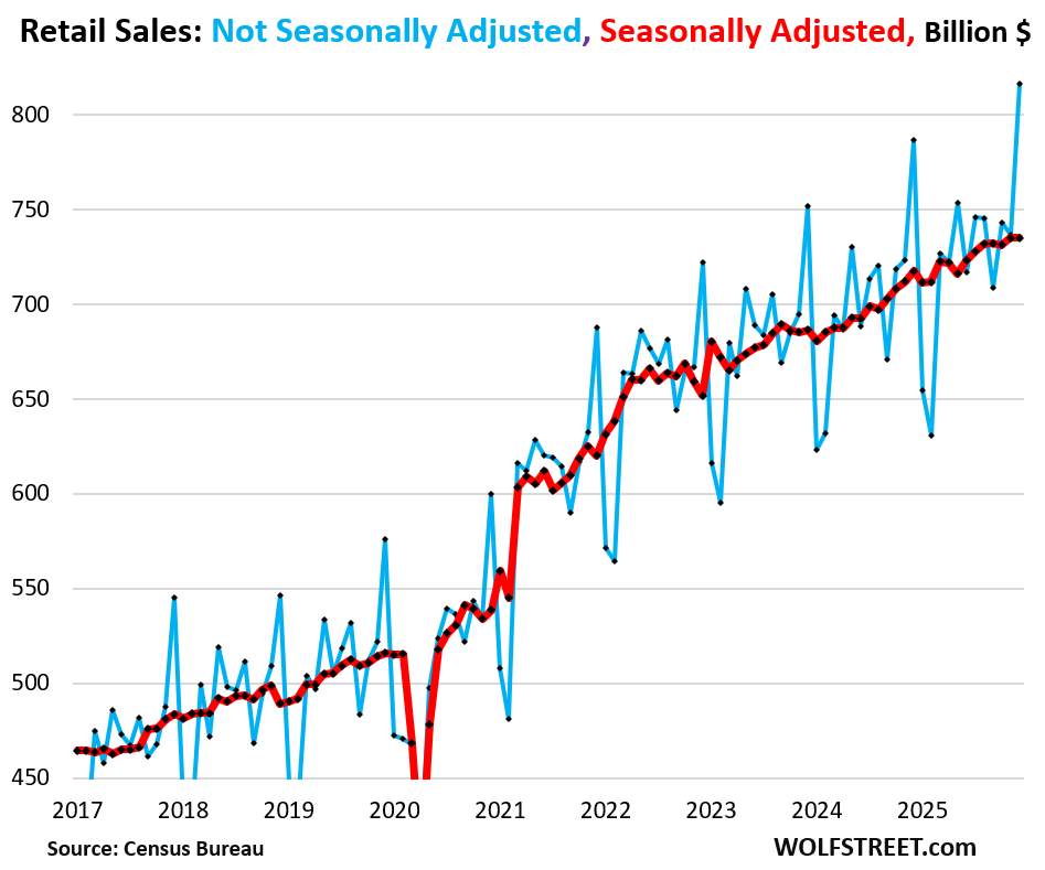 The seasonal adjustment factor whacked $35.7 billion off actual sales in December, the most ever. That was 12.6% more than in December 2024, when it had whacked off $31.7 billion. Clearly, something went awry in that seasonal adjustment factor.