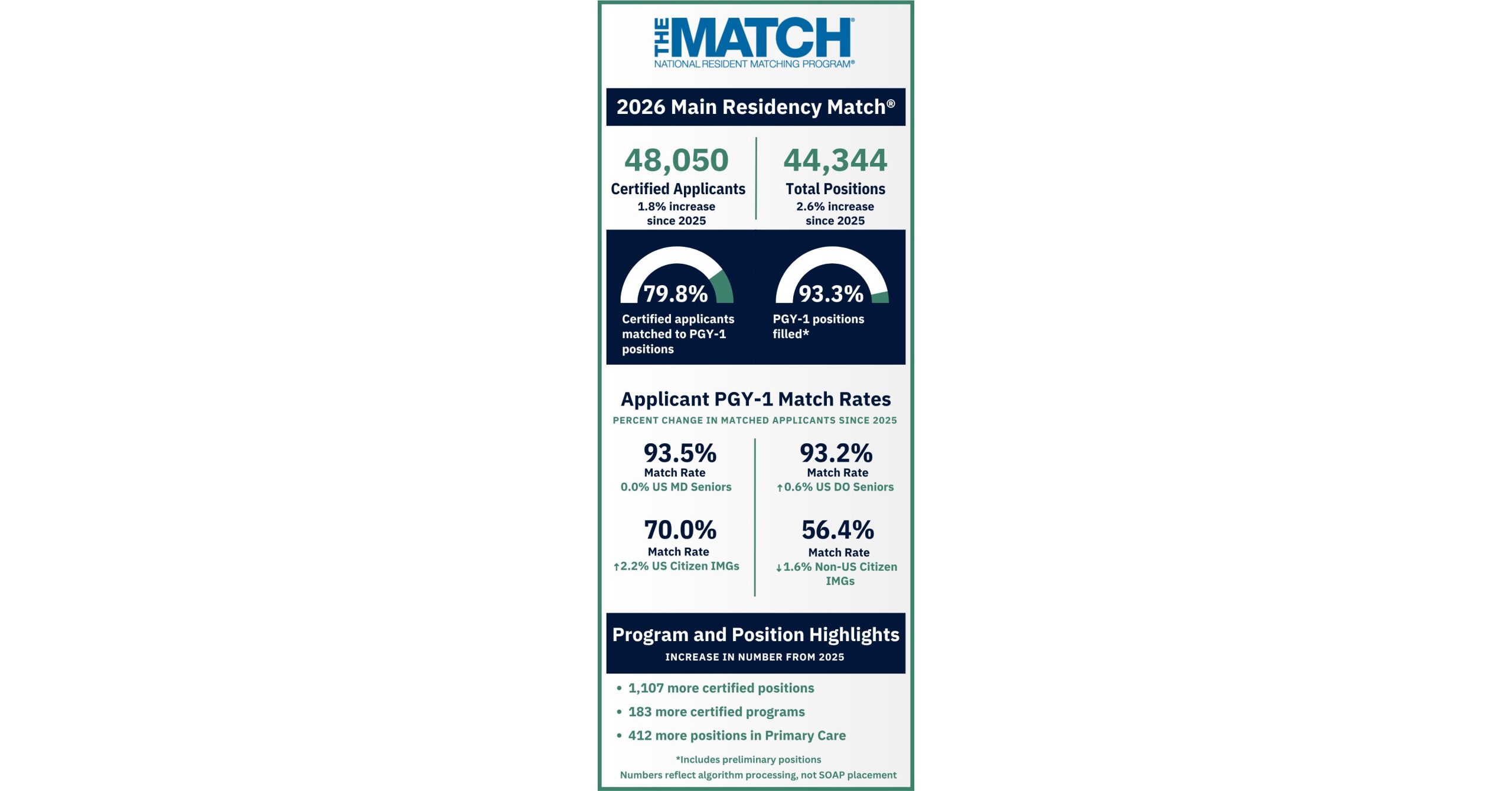 Of the 53,373 applicants registered, 48,050 certified a rank order list (“active applicants”), representing an increase of 842 applicants (1.8 percent) over last year. Among active applicants, 38,354 matched to a post graduate year-1 (“PGY-1”) position, an increase of 687 (1.8 percent) from 2025. Across both PGY-1 and PGY-2, the Match filled a total of 41,482 positions.