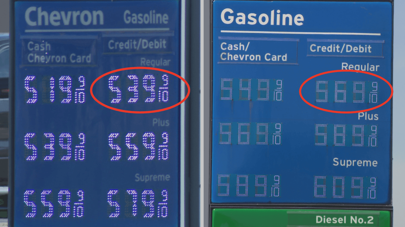 Images taken at the Chevron on Oak Street show regular gasoline increasing from about $5.39 (credit/debit) per gallon last week to $5.69 (credit/debit) per gallon, a jump of roughly 30 cents in just seven days.