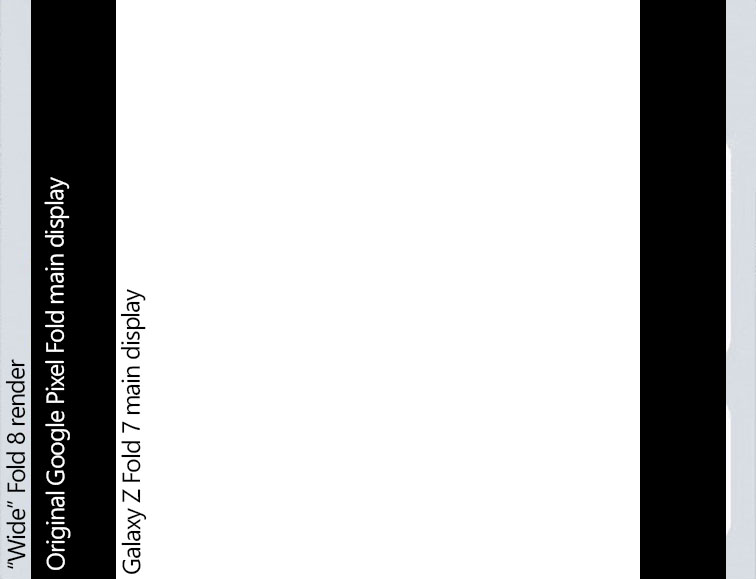 There’s not much else to go off of here outside of a couple of (near identical) animations, showcasing this wide folding phone opening up to reveal an even-wider interior display. Without exact specs, it’s difficult to make assumptions on anything related to these screens, but that doesn’t mean we can’t speculate a bit. Taking the front image in this render into Photoshop (and cropping around the display portion of the schematic) reveals a nearly perfect 16:10 rectangle, significantly wider than the 17.4:9 aspect ratio used by the original Pixel Fold. As a result, the inner display also appears wider, revealing a roughly 9:7 aspect ratio compared to the 1.11:1 ratio of the Fold 7.