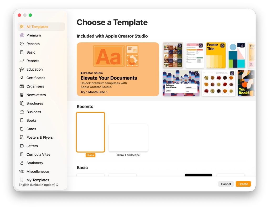 There are a couple of reasons why you might choose to continue using the originals rather than the ACS versions. The first is a somewhat intrusive invitation to subscribe. When you create a new Pages document, for example, you’ll see that as the most prominent option ahead of the built-in templates.