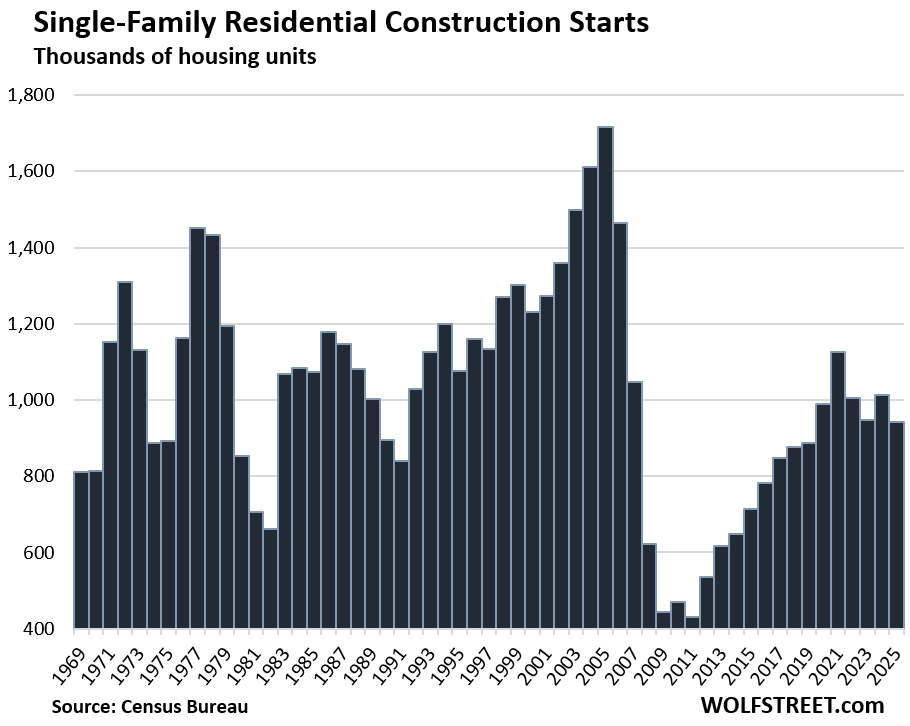 Construction starts of privately owned single-family housing units, at 943,000 in 2025, were down by 6.9% from 2024 but roughly on the same pace as in 2023, as homebuilders pulled back amid very high inventories of new homes for sale and falling prices.