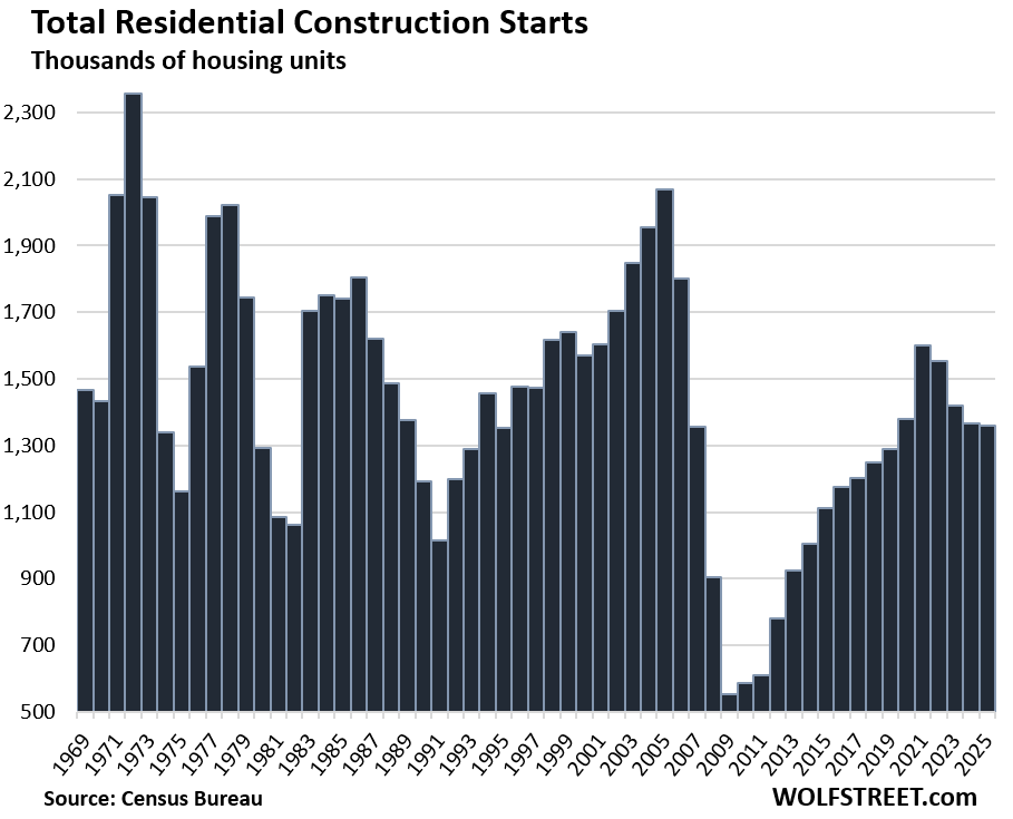About 2.3 people occupy a housing unit on average. So the 1.36 million housing units that were started in 2025 would provide a home, when completed, for 3.1 million additional people. But the US population increased by only 1.78 million people in the 12 months through mid-2025; and for the 12 month through mid-2026, it is projected to grow by only 756,000 people; and growth might further decline in the following years, according to the Census Bureau’s estimates.