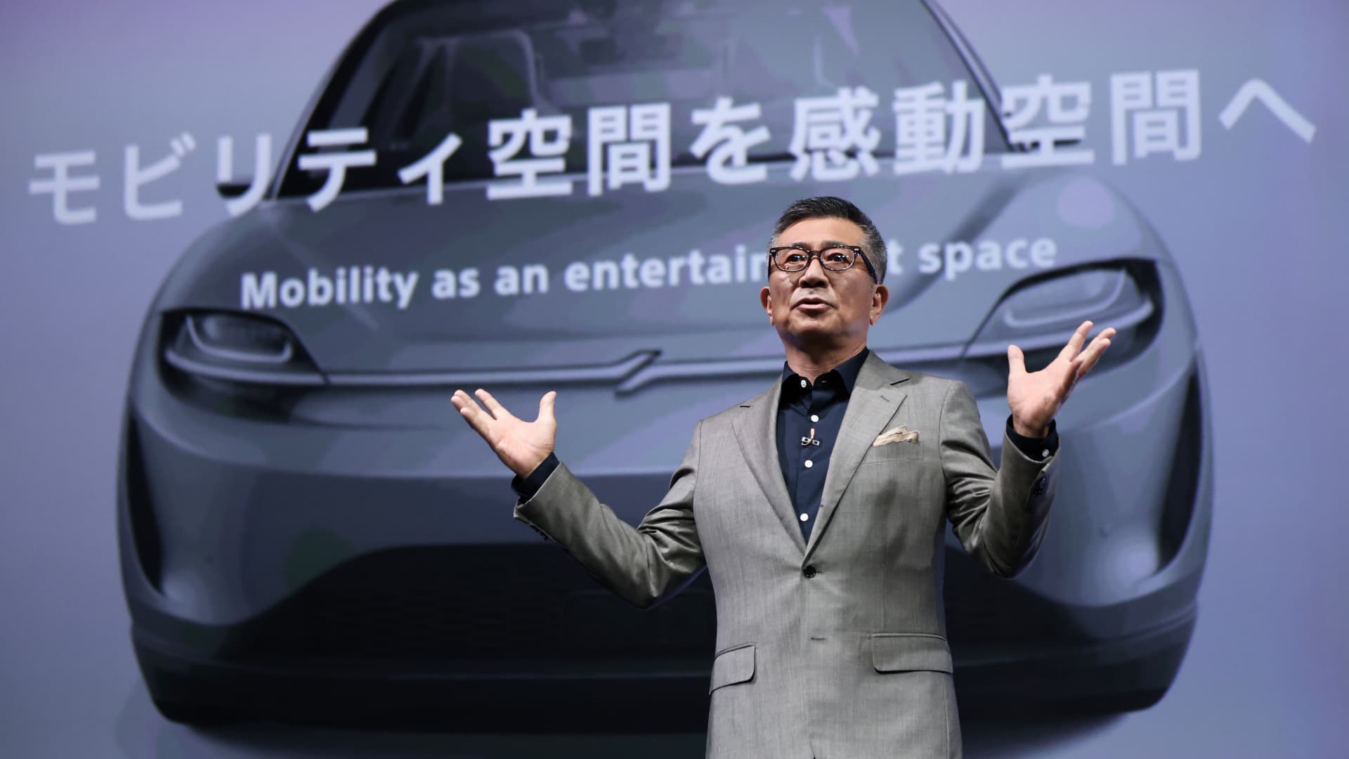 Sony Honda Mobility CEO Yasuhide Mizuno speaks at a news conference in Tokyo, on Oct. 13, 2022. Sony and Honda’s joint mobility venture unveiled a new EV prototype in January.