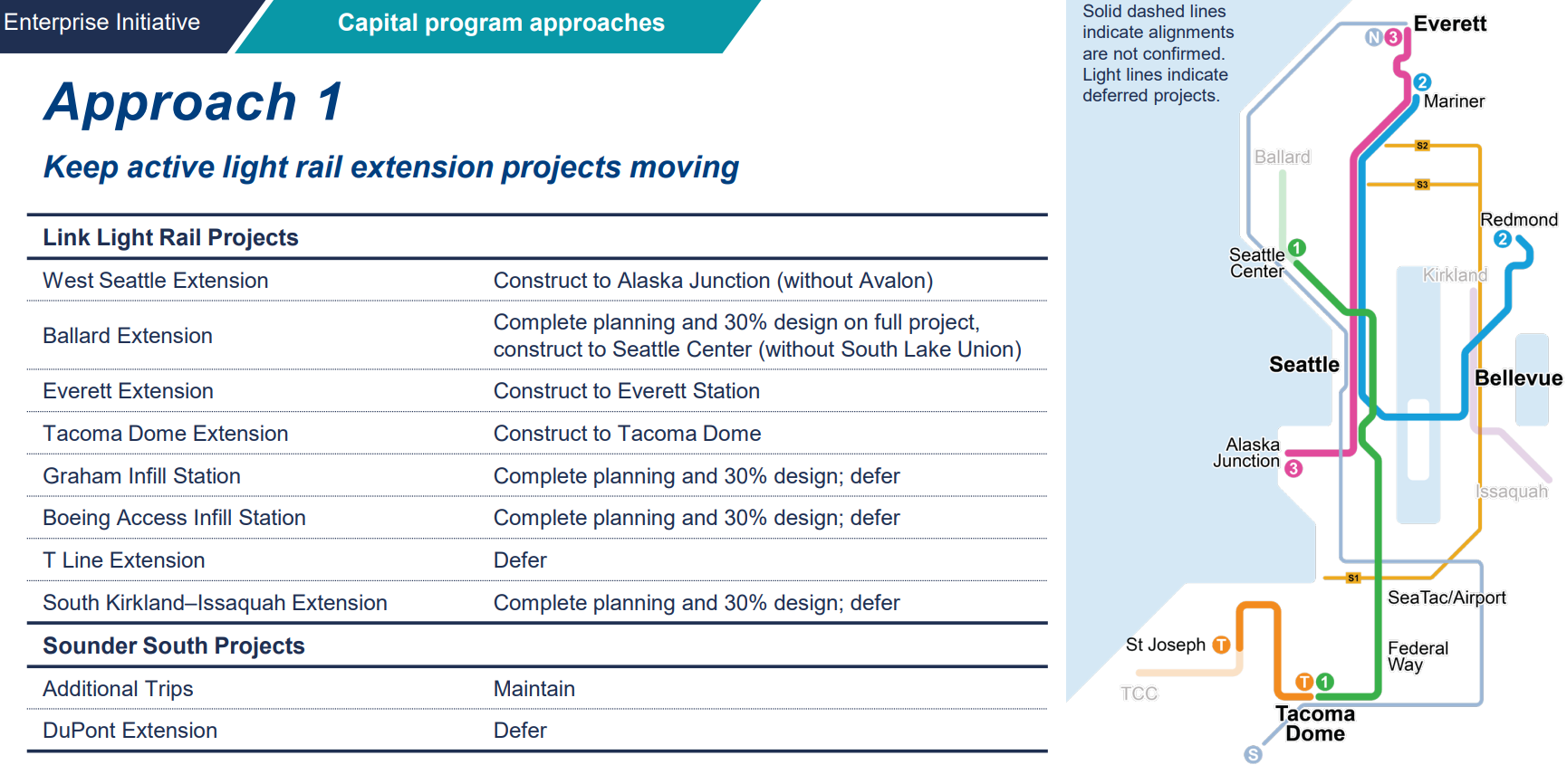 “The approaches you’ll see today are meant to be starting points, not solutions,” CEO Dow Constantine said in introducing the proposals. “The approaches are meant to be illustrative, they’re meant to provide meaningful contrasts for the board’s deliberations as you weigh how to update the Sound Transit 3 system plan.”