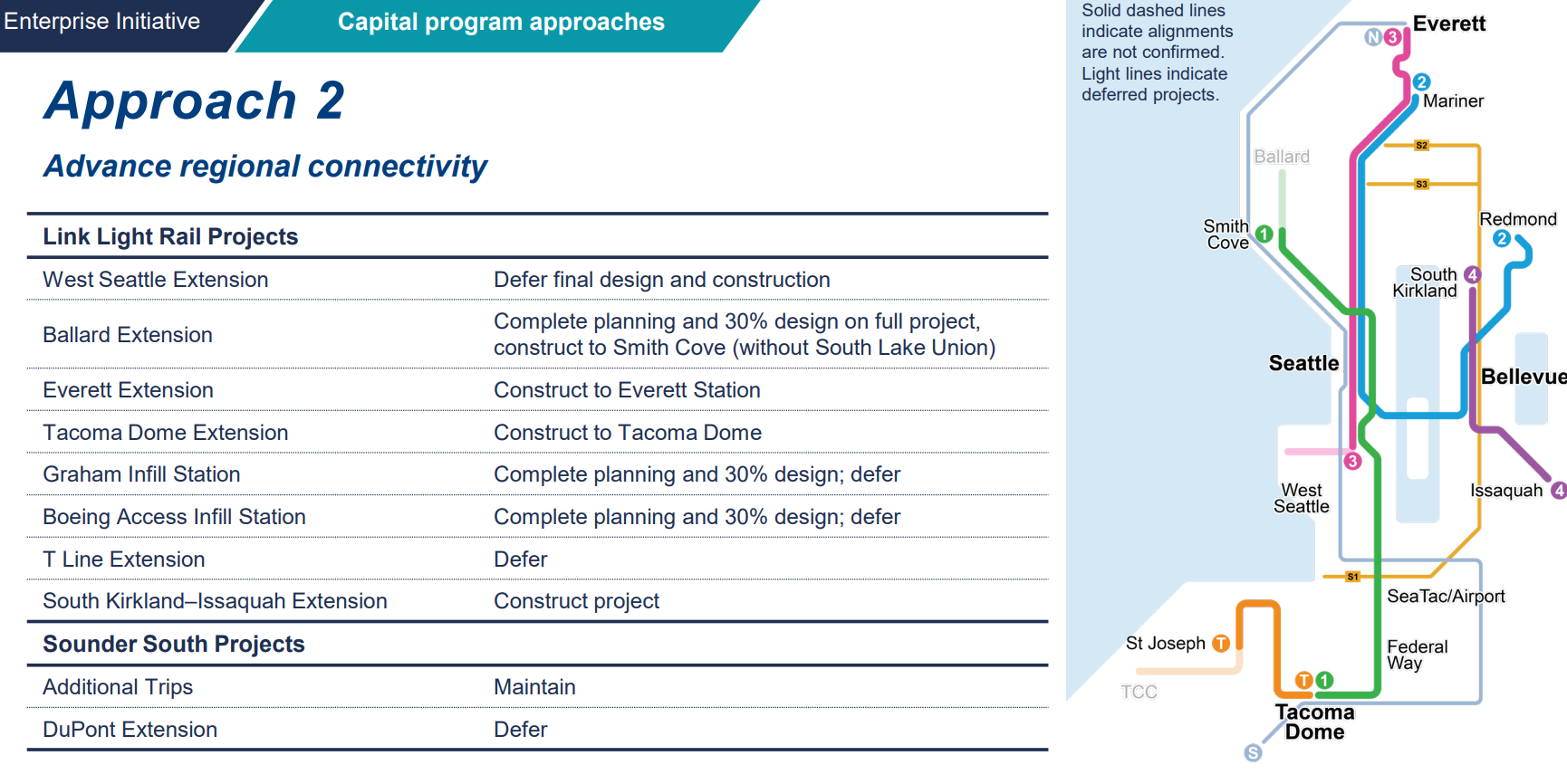 The second option disregards which projects are in active planning, deferring the entirety of West Seattle Link, but keeping the 4 Line on track. Graham Street and Boeing Access Road would also be deferred, along with the T Line and Sounder extensions in Pierce County. Ballard Link would terminate at Smith Cove under scenario 2.