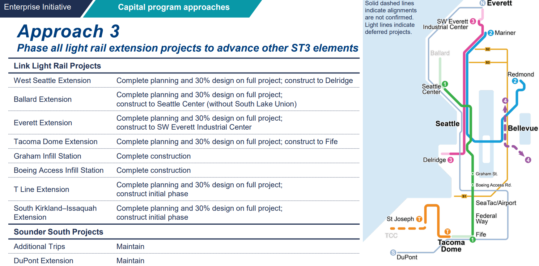 The third option put in front of the board is really more of a planning exercise: what would it look like to phase every project. Ballard Link would stop at Seattle Center, Tacoma Dome would only make it to Fife, West Seattle Link would be a stub line to Delridge Way, and Everett Link would only make it to Southwest Everett Industrial Center.