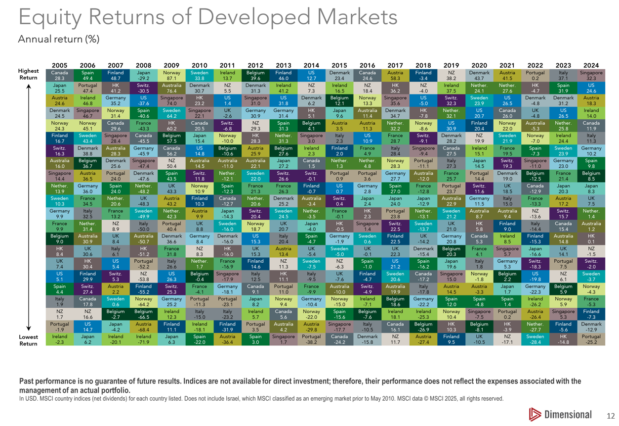 As a diversified investor, I don’t try to pick the winners in advance. That’s true for asset classes and countries. Dimensional Fund Advisors has a great chart that ranks developed market country stock performance by year: