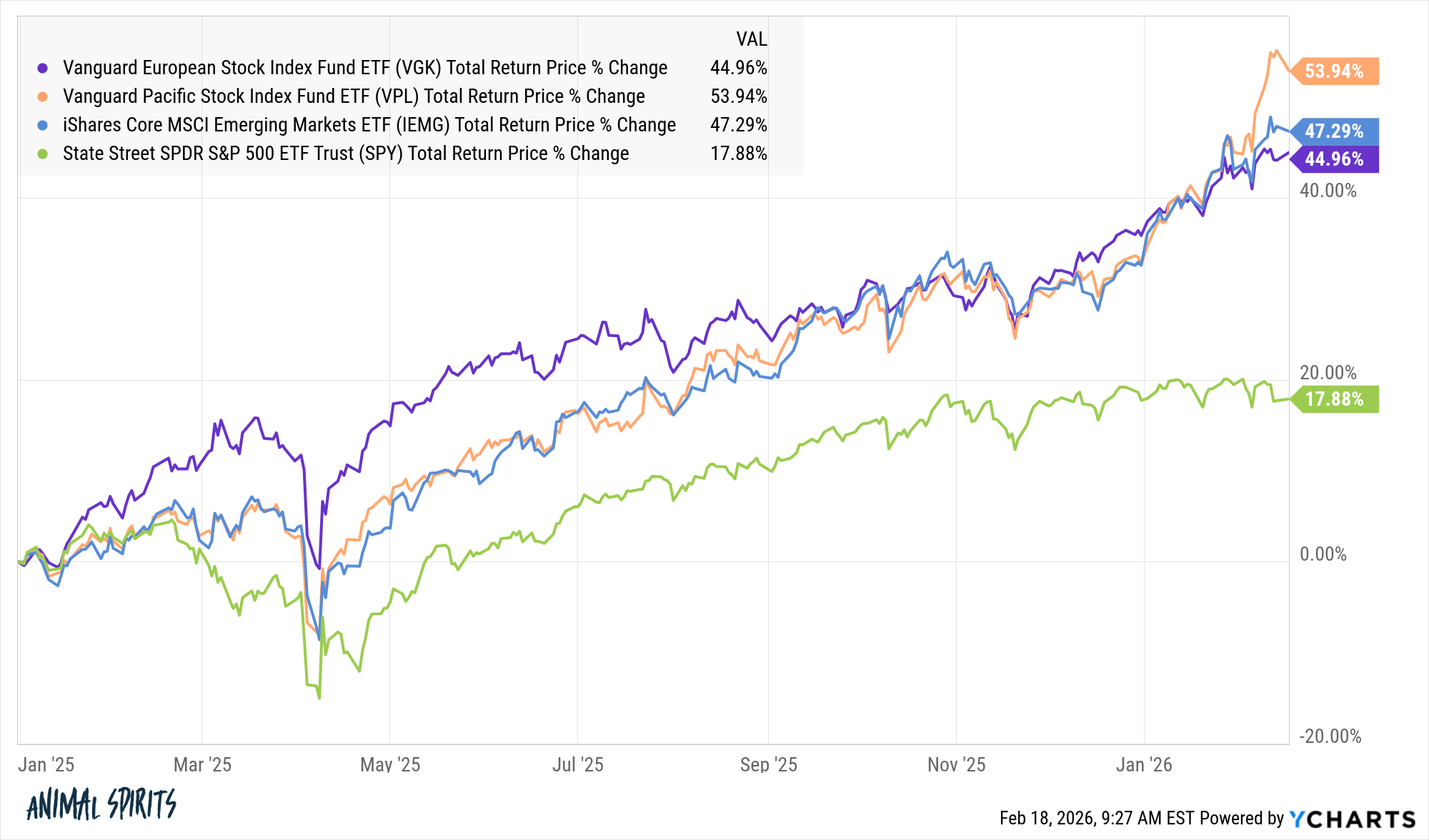 If you look back to the start of 2025, the outperformance by European stocks, Asian stocks and emerging markets is now quite large: