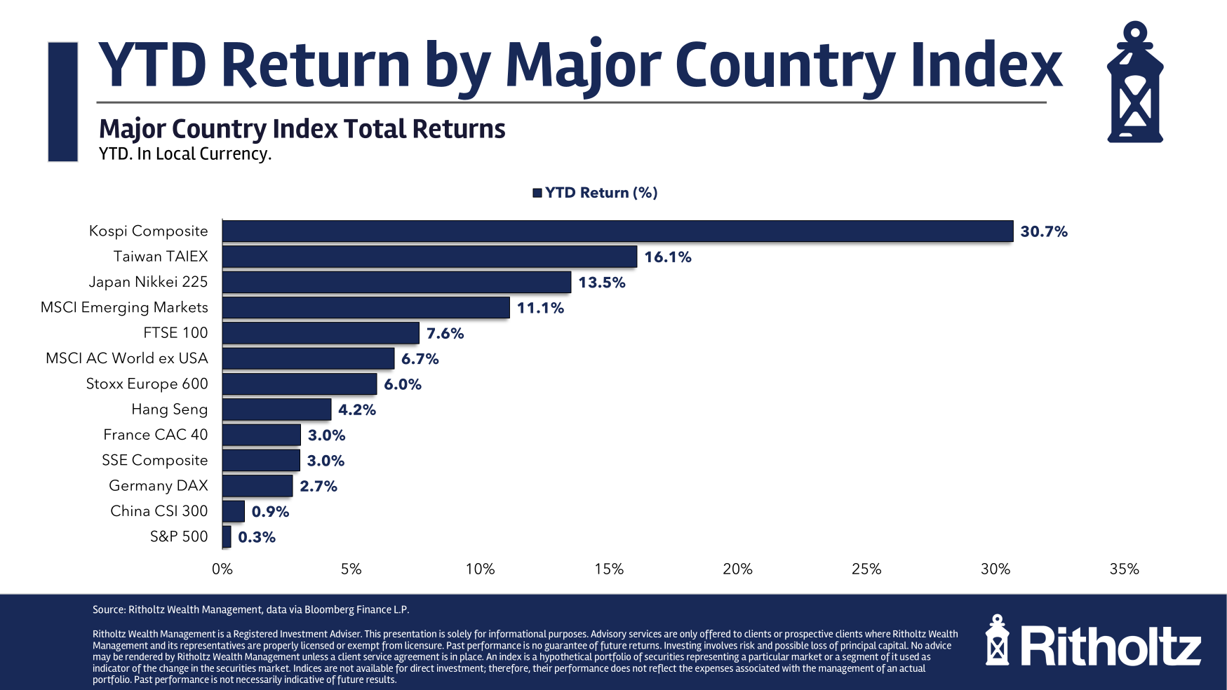 But this is not just a currency play. Even in the home currencies, these stock markets are outperforming the S&P 500 this year: