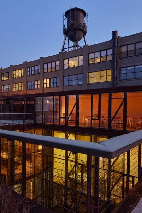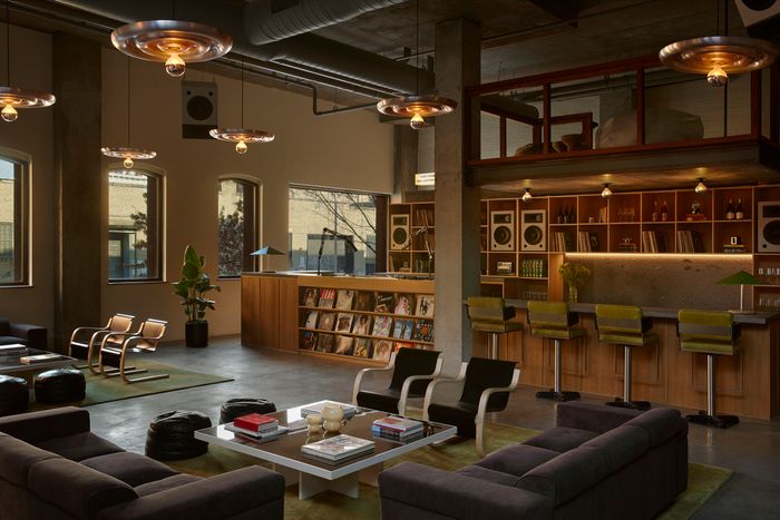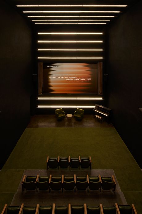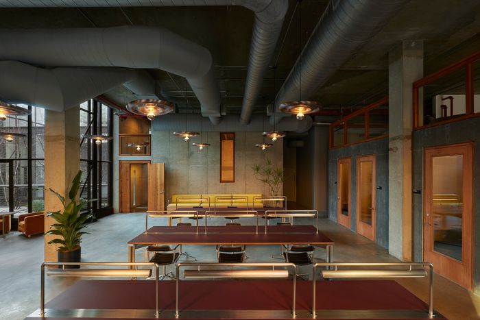 Maybe because there was already a sense of being watched. “Almost anywhere in this building, you can see what’s going on,” says Nathan Warkentin, the designer who was tapped to repurpose this 1872 former factory. He paused in a slender, vertical window cut into a concrete stairway, which peered over shared wooden desks that were walled in meeting rooms he custom-designed. (The whiteboards were modeled after a blackboard used by Le Corbusier.) Warkentin was tapped to turn what was once one of the flashiest tech offices of the 2010s — a hub for Kickstarter — into a flex office branding itself as one of the flashiest offices of the 2020s. The bones were there: a theater, a roof garden where TikTok chefs could grow herbs, and a central glass courtyard that gives views of the interior rooms — functioning like a red carpet that might help in a mission to spot talent. Funded by memberships and partnerships with brands (TikTok, iHeartMedia, Shopify, Samsung), the Lighthouse is a kind of cross between a flex office and a 21st-century movie studio, with a dash of elitist country club. A selection committee of other extremely online people vets anyone who’s signed up for pricey memberships at around $5,750 a year.