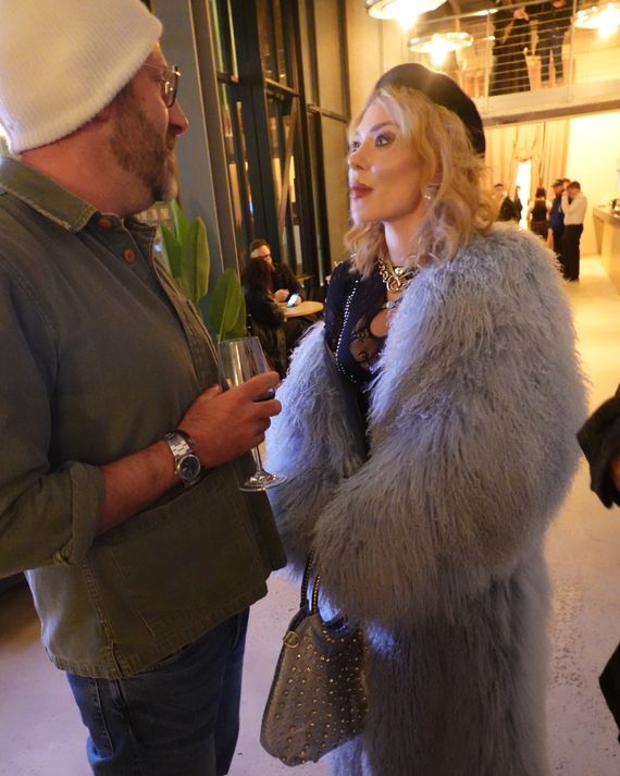 At the end of the night, in a room Warkentin designed to be a kind of living room for the building — there are two sets of couches facing a wall of shelving for vinyl records and a DJ booth — members of the band Beach Fossils played millennial nostalgia hits (“Since U Been Gone” and “Call Me Maybe”). On the other side of a wall, three screens broadcast the action elsewhere at the party live to guests sitting around a long shared desk and grouped in intimate wood-paneled study carrels. Volpe, the stylist in a powder-blue fur, was chatting with Storm Yokouchi, a designer who came to network, a goal that was helped by the T-shirt he was wearing, imprinted with the name of his brand. “It feels good to make things with your hands,” he said.