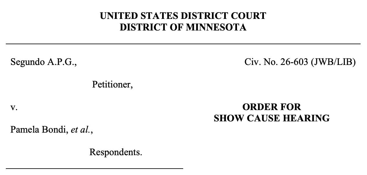 In one order issued January 14 in Juan Tobay Robles’s case, Chief Judge Patrick Schiltz — a George W. Bush appointee — noted that the habeas petition was filed on January 8 and a response was ordered to be filed by January 12.