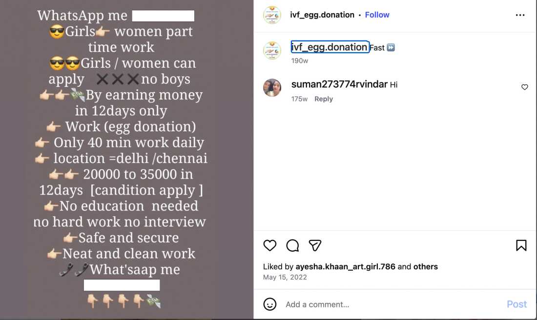 These notices on Instagram are recruiting women to sell their eggs for IVF. We obscured the phone number that was listed because of the illegal nature of this activity.