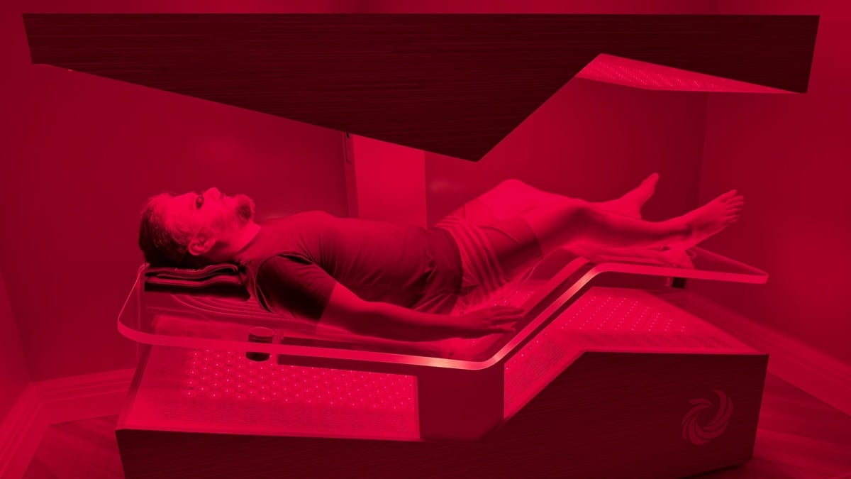 The chamber combines red and infrared light, molecular hydrogen inhalation, guided meditation and breathwork, vibroacoustic sound therapy, and pulsed electromagnetic field (PEMF) therapy into one immersive experience.