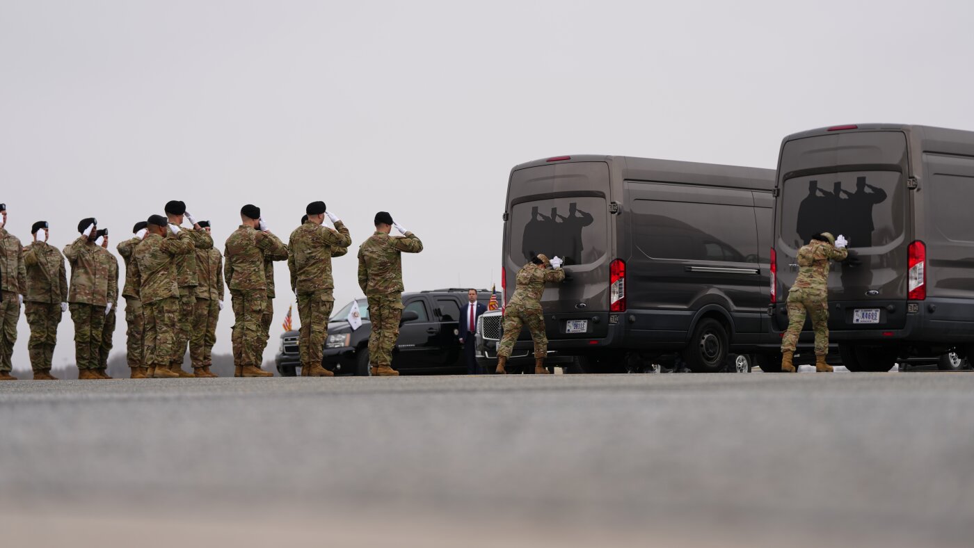 Door attendants U.S. Air Force Master Sgt. Christina Jiminez and Senior Airman Awng Dingrin close the doors of the transfer vans containing the remains of U.S. Army Reserve soldiers Maj. Jeffrey O’Brien, 45, of Indianola, Iowa, Capt. Cody Khork, 35, of Winter Haven, Fla., Chief Warrant Officer 3 Robert Marzan, 54, of Sacramento, Sgt. 1st Class Nicole Amor, 39, of White Bear Lake, Minn., Sgt. 1st Class Noah Tietjens, 42, of Bellevue, Neb., and Sgt. Declan Coady, 20, of West Des Moines, Iowa, who were killed in a drone strike at a command center in Kuwait after the U.S. and Israel launched a military campaign against Iran, during a casualty return Saturday at Dover Air Force Base, Del.