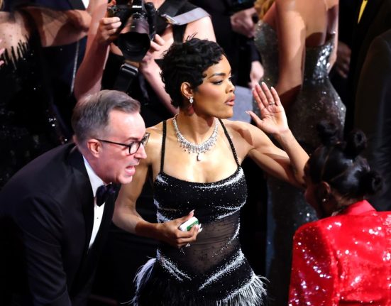 A woman looks at a building where an apartment was targeted by an Israeli airstrike in the Burj Hammoud area on the northern outskirts of Beirut on March 14, 2026.