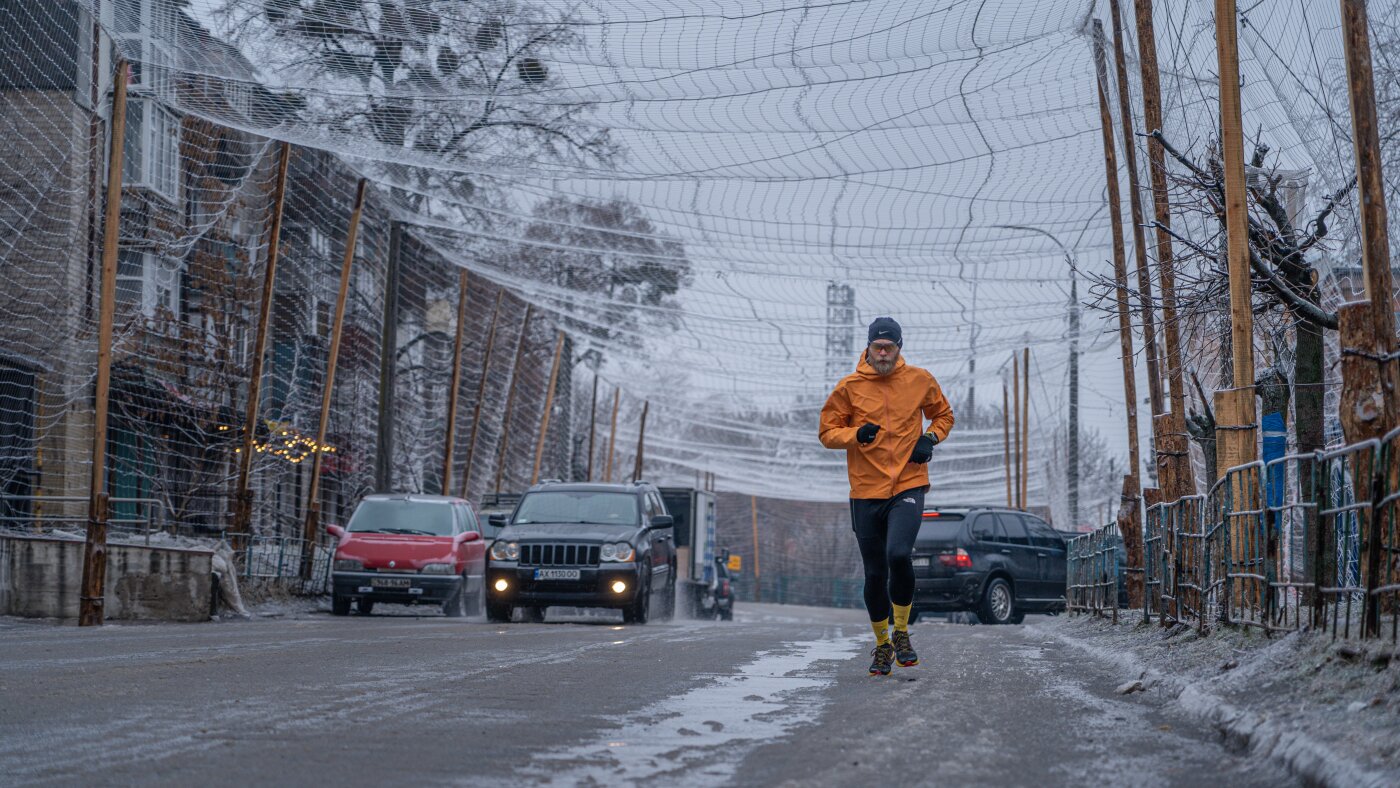 Outside the café, cars drive along roads inside a tunnel of netting, and people go about their everyday lives as best they can. Twenty-year-old Maksym Yevsiukov makes his way up the icy sidewalk under the drone nets. He says he doesn’t mind them because he knows they’re here to keep people safe. He and his family lived under the Russian occupation.