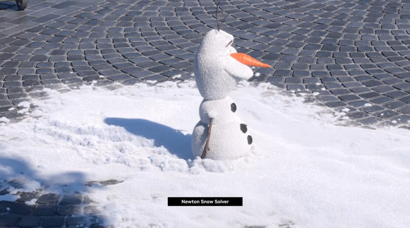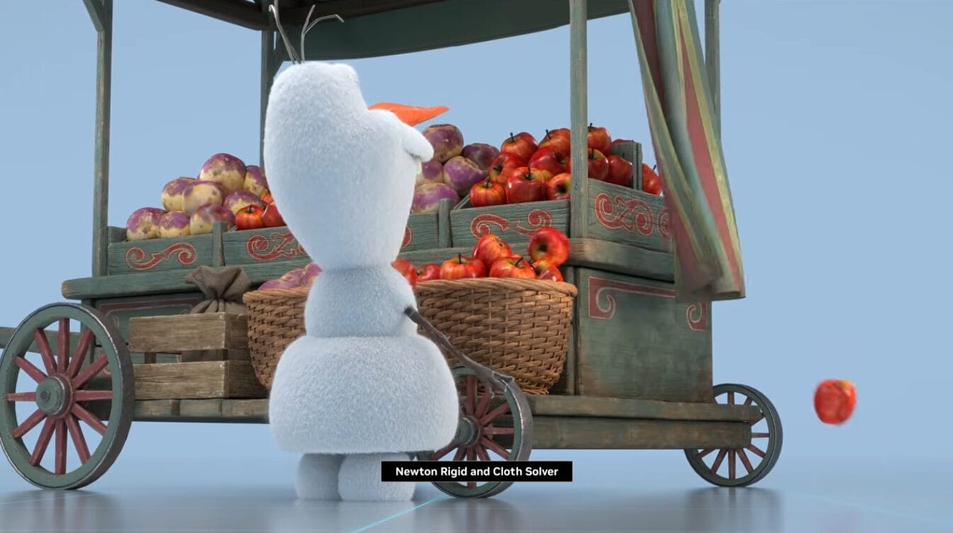 NVIDIA worked with Disney Research on their proprietary Kamino simulator, a GPU-based physics solver that trains robots via thousands of parallel environments, allowing the robot to learn through deep reinforcement in simulation. Olaf was used to demonstrate how this translates to navigating real-world obstacles and terrain, with examples showing a collision with a cart and walking through snow.