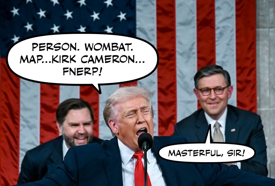 Still, the Dotard defied the skeptics, maintaining sphincter control throughout the entirety of the longest State of the Union speech in two hundred and fifty years of this increasingly wacky experiment.