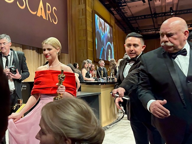 One of the most moving moments at the Oscars was Jordan’s first win. “God is good,” he said. The standing ovation and cheers resounded at the Dolby; afterward, DiCaprio gave Jordan a long-ass hug. And at the Governors Ball, Jordan still looked overwhelmed as he had his Oscar engraved. Like he couldn’t believe his good fortune. Waiting her turn was the first Irish Best Actress winner, Jessie Buckley, whose lead was never challenged; she was the sole win for “Hamnet” (Focus).