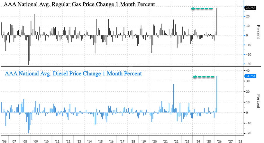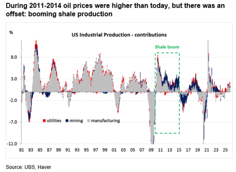 Kapteyn noted that, on an inflation-adjusted basis, oil prices in 2011-2014 were actually higher than they are today, yet the U.S. economy absorbed that shock because the shale boom provided a lift to the industrial base. Soaring WTI crude prices at the time spurred oil/gas companies to increase drilling activity, production growth, and energy-sector investment. This helped create a tailwind for the US’ manufacturing base and offset some of the drag from higher fuel costs.