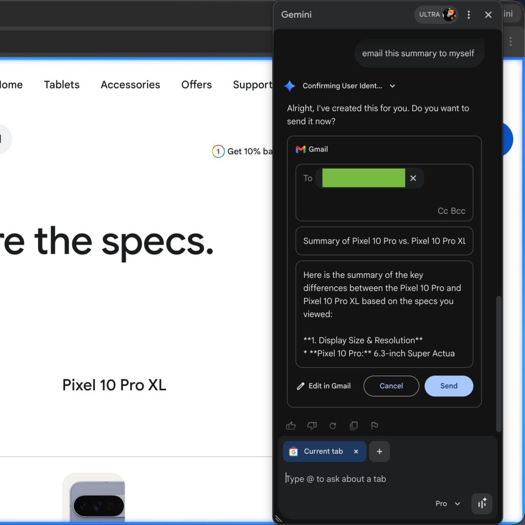 Meanwhile, I am loving the ability to send emails right from Gemini in Chrome. This feature debuted for the browser and allows you to email the contents of your conversation or anything else, and press send without leaving the side panel. It’s not really an AI feature in the grand scheme of things but rather an integration.