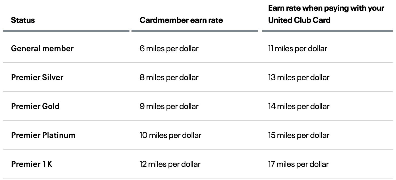 For example, a Premier 1K member with a co-branded credit card would earn 12x miles per dollar spent when paying with another card, while if they paid with the United Club Card, they’d earn 17x miles per dollar spent (since the card offers an incremental 5x miles).