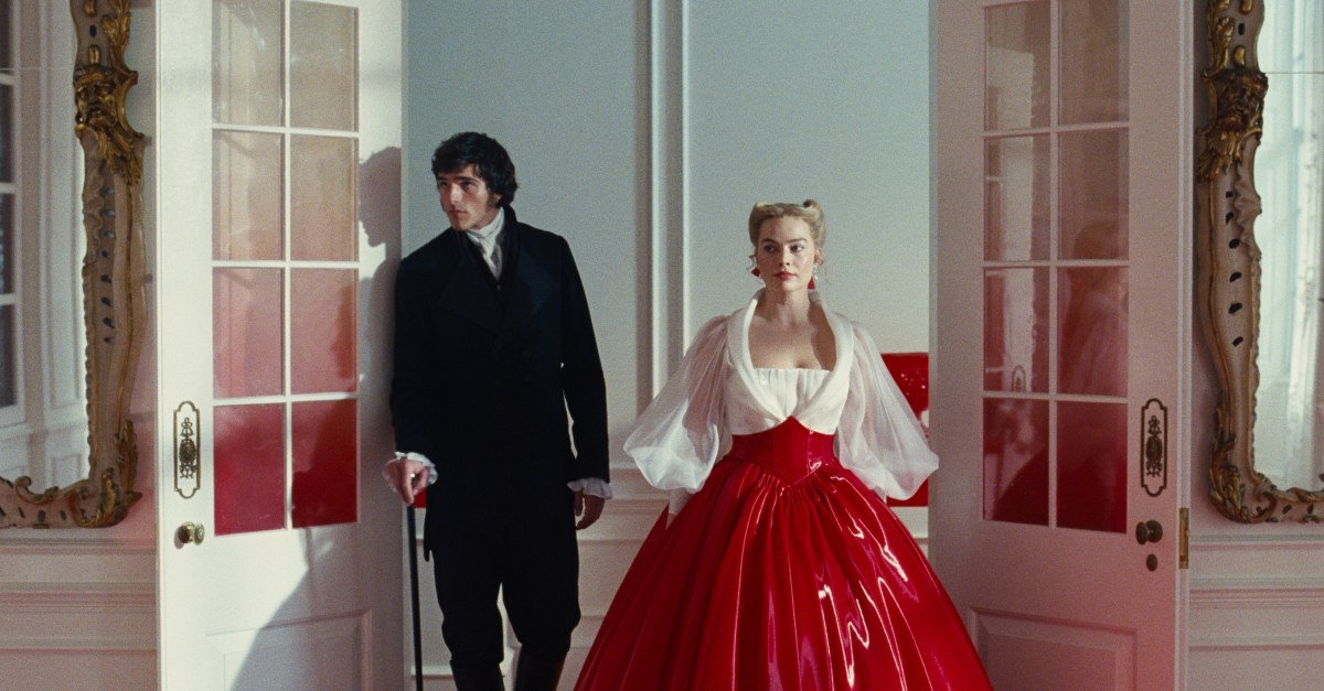 Fennell’s film opens with the sounds of a body writhing in what the audience at first believes to be sex, but soon learns are actually death throes. Its ostentatiously perverse production design is filled with rooms wallpapered with flesh-colored leather, complete with veins and moles; long, lingering closeups of moist slug trails; characters outfitted in full red latex skirts or transparent cellophane drapery. It is a film that palpably wants to be thought of as kinky — a storytelling mode that should mesh nicely with Brontë’s bleak, merciless world.
